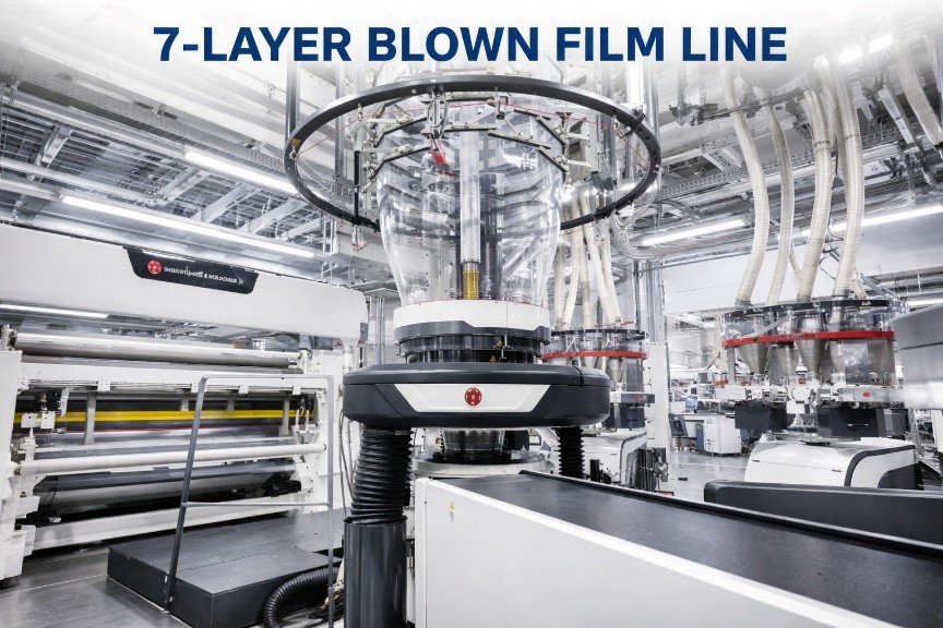 7-layer co-ex blown film lines address the majority of industry packaging development requirements. With improved barrier and strength properties, applications include films for long shelf-life packaging of edible oils, UHT milk, liquid and solid container liners, and technical applications. These versatile lines also produce films for lidding, frozen food packaging, meat packaging, and vacuum packaging.